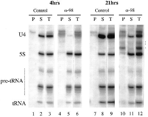 Figure 3. Failure of snRNA precursors to leave the nucleus of anti-xNup98 treated oocytes. Total nuclear RNAs (T), corresponding to those in lanes 1 and 3 of Fig. 2, A and B, were immunoprecipitated with anti-m7G antibodies, which are specific for the cap structure of the nonexported, nuclear precursor snRNA. The RNAs in the precipitate (P) and supernatant (S) fractions were analyzed as in Fig. 2. Dots by lane 12 indicate m7G-capped degradation products of pre-U4 RNA that also are observed when nuclear export is inhibited by other reagents. |