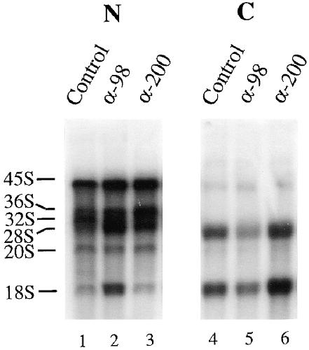 Figure 5. Reduced export of ribosomal RNAs in the presence of anti-xNup98 antibodies. Buffer (Control) or antibodies specific for xNup98 (α-98) or xNup200 (α-200) were injected into oocyte nuclei. 2 h later α[32P]GTP (∼1.0 μCi/oocyte) was injected into the cytoplasm of all oocytes. After 20 h of labeling, the intracellular distribution of newly made endogenous ribosomal RNAs was determined by analyses of 0.5 oocyte equivalents of nuclear (lanes 1–3) and cytoplasmic RNAs (lanes 4–6) in a 1.2% formaldehyde–agarose gel. The electrophoretic mobilities of precursor (45, 36, 32, and 20S) and mature (18 and 28S) ribosomal RNAs are indicated. |