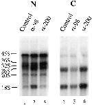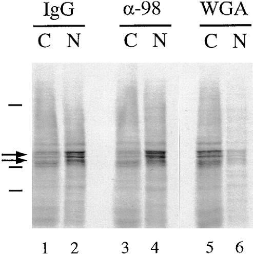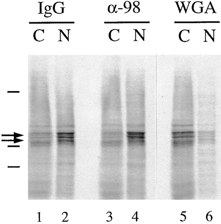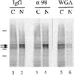 Figure 6. Lack of effect of anti-xNup98 antibodies on import of karyophilic proteins. Normal IgG (IgG), anti-xNup98 (α-98), or WGA was injected into oocyte nuclei (IgG, α-98) or cytoplasms (WGA). 2 h later, 0.25 oocyte equivalents of 35S-labeled total soluble nuclear proteins were injected into the cytoplasm of all oocytes. After 24 h incubation, oocytes were manually dissected, and total nuclear (N) and cytoplasmic (C) extracts were prepared from pools of 3–5 oocytes. 0.5 oocyte equivalents of the extracts were analyzed on a 10% polyacrylamide gel containing SDS and 35S-labeled proteins were detected by autoradiography. Arrows indicate the strongly labeled karyophilic proteins N1/N2 (Dabauvalle and Francke, 1982). Lines indicate the positions of molecular weight markers of 200, 97, and 66 kD. |