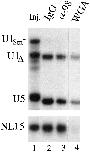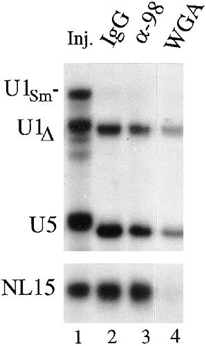 Figure 7. Unimpaired import of snRNPs and small RNAs in the presence of anti-xNup98 antibodies. Oocytes that had been pre-injected with antibodies or WGA, as in Fig. 6, were injected in the cytoplasm with a mixture of 32P-labeled U1Smâ, U1Î, U5, and NL15 RNAs that were made by in vitro transcription. After 7 h of incubation, import of the RNAs was monitored by polyacrylamide gel analysis of 0.5 oocyte equivalents of nuclear RNAs isolated from pools of 3â5 oocyte nuclei. The mixture of injected RNAs (Inj.) is shown in lane 1; the slightly faster gel mobilities of U1Î (a mutant U1 RNA lacking the U1A protein binding site) and U5 RNAs in lanes 2â4 are due to 3â² end trimming which occurs upon nuclear import of snRNPs (Neuman de Vegvar and Dahlberg, 1990). U1Smâ RNA lacks the Sm binding site required for import and serves as a control for cytoplasmic contamination of the nuclear samples. Cytoplasmic fractions are not shown, as RNA levels were in excess, and differences among them were not significant. |