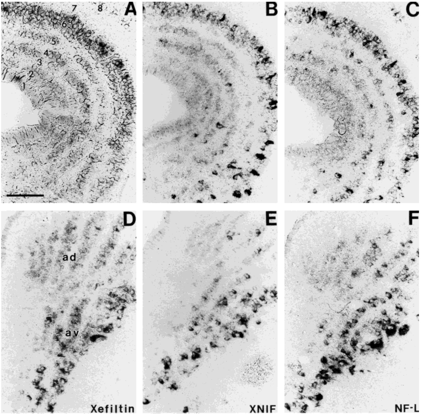 Fig. 7. Xefiltin (A,D), XNIF (B,E), and NF-L (C,F) mRNA expression