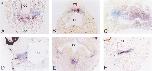 FIG. 4.Sections through the mouth region of embryos stained for Xbap [cc: now called nkx3-1]mRNA (A) or gsc mRNA (A, B, C, and F). Horizontal sections are oriented with anterior at the top. Transverse sections have ventral to the bottom. The positions of the cement gland (cg) and the oral cavity (oc) within the sections are indicated. All sections were photographed at 1001 magnification except C, which is 4001. (A) Transverse section through a double-stained stage 37 embryo. Xbap staining is blue and gsc staining is purple. Both sequences are expressed ventrolat- eral to the oral cavity with Xbap occupying a more lateral position. (B) Horizontal section through the a stage 37 embryo showing Xbap and gsc expression anterior to the oral cavity. Xbap staining marks more lateral tissues. (C) Magnified view of the section shown in B. Notice that the Xbap and gsc staining regions closely abut and appear to overlap in a small area (gray region). (D) Transverse section through the middle of the oral cavity of a stage 37 embryo stained for Xbap sequences alone. Intense Xbap staining is restricted to a small region of tissuelateral to the oral cavity. (E) Transverse section through the posterior of the oral cavity of a stage 37 embryo stained for Xbap alone. A narrow region of Xbap expression is located ventral to the oral cavity, while fainter staining extends upward along the edges of the cavity. (F) Transverse section through the posterior of the oral cavity of a stage 37 embryo stained for gsc alone. Notice that the domain of gsc expression is broader than the Xbap expression shown in E.