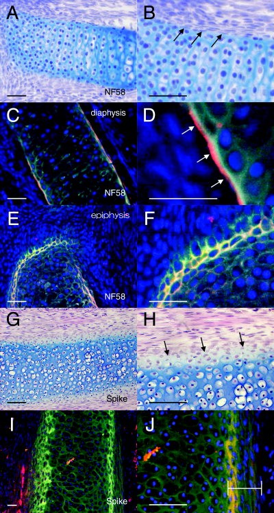 Figure 2. Comparison between st58 tibia and spikecartilage. Hematoxylin-eosin and alcian blue staining of the section of st58 tibia. A,B: The cartilage was well differentiated and the obvious boundary between the cartilage and other tissue was formed in the diaphysis. Some flat cells forming the perichondrium were observed (B, arrows). CâF: Double-immunolabelling of st58 tibia with antibodies specific for type I and type II collagen. C,D: In the diaphysis, immunolocalization of type I collagen in the outer layer of the perichondrium (C, arrows) and type II collagen in the inner cellular layer of the perichondrium and cartilage matrix was visualized, using rhodamine- and fluorescein isothiocyanate-conjugated secondary antibodies, respectively. E,F: In the epiphysis, many chondrogenic cells exhibited immunoreactivities for both type I and type II collagen. G,H: Morphology of the spikecartilage. Marginal region of the spikecartilage was slightly stained with alcian blue (H, arrows). I,J: Immunoreactivities for type I and type II collagen. Obviously separated signals of type I and type II collagen were not observed in the marginal region of cartilage (solid line). Nuclei were stained with DAPI (CâF, I, J). Scale bar = 50 μm.
