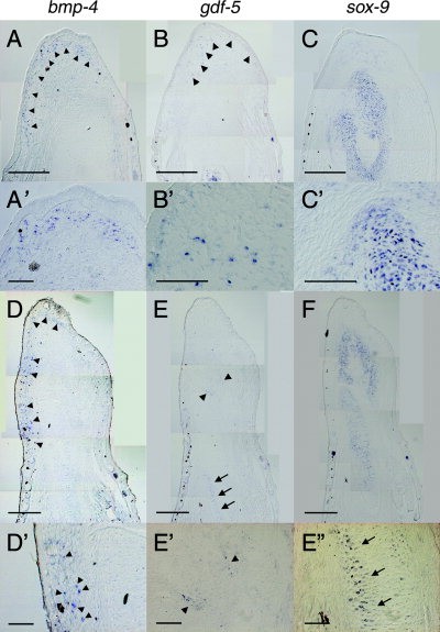 Figure 4. Expression of bmp-4, gdf-5, and sox-9 in regenerating froglet blastema. A-C: Middle stage of a blastema. Bmp-4 expression was detectable in the distal region of the blastema (A, arrowheads). Aâ²: Higher magnification of A. Bmp-4 was expressed in the mesenchyme beneath the epidermis. Gdf-5 expression was also observed in the region corresponding to bmp-4 expression (B, arrowheads). Bâ²: Some signals of gdf-5 transcription were present not only beneath the epidermis but also in the interior. Sox-9 was expressed in chondrocytes (C,Câ²). DâF: Late stage of a blastema. Arrowheads point to several bmp-4 expressing cells (D,Dâ²). Note the âsalt and pepperâ pattern characteristics of the bmp-4 signal. The accumulation of bmp-4 expressing cells was not detectable in the peripheral region of the cartilage. In the peripheral region of the cartilage, bmp-4 was expressed sparsely (Dâ²). E: Gdf-5 expression in the late stage of blastema. Eâ²,Eâ²: Higher magnifications of E. In many cases, blastema consisted of some cartilage elements. The blastema expressed Gdf-5 in the boundaries of each element (E,Eâ², arrowheads), which expressed sox-9 (F). Gdf-5 was also expressed in the proximalcartilage (E, Eâ², arrows). Scale bar = 500 μm (Aâ²,Bâ²,Câ²,Dâ²,Eâ²,Eâ²) and 100 μm (AâF).