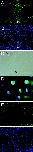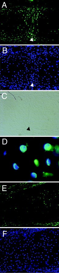 Figure 6. Immunoreactivity for phosphorylated Smad-1/5/8 (pSmad-1/5/8). The joint-like formation was stained for pSmad-1/5/8 (A,D) and for nuclei by DAPI (B,D). Bright field (C). Arrowheads show identical cells. D: Double labeling for pSmad-1/5/8 (green) and nuclei (blue) in the joint-like region showing nuclear-localization of pSmad-1/5/8. E: The intact spike was stained for pSmad-1/5/8 (E) and for nuclei by DAPI (F). Comparing with A, weaker signals of pSmad-1/5/8 proteins were observed in the intact spikecartilage.