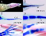 Figure 1. A: A normal forelimb of the Xenopus froglet. B: The autopodium of a normal hand. Well-developed diaphysis stained with alizarin red and epiphysis stained with alcian blue were observable. Two to three joints are formed. C: A cone-shaped hypomorphic structure formed on the forelimb at 5 weeks after amputation. This was the spike formation. D: The spike was stained with alcian blue. This shows that the spike consists of a single continuous cartilage. (E) A section of the spike that was formed on the forelimb at 5 weeks after amputation. Lines indicate the amputation level.