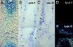 Figure 7. A: Histological analysis of a segmented spike. The section was stained with alcian blue, eosin, and hematoxylin. B,C: Analysis of molecular markers in the BMP4-implanted spike by section in situ hybridization. B: Gdf-5 expression. Although gdf-5 expression was still observed in the peripheral cartilage, remarkable expression was not observed in the joint-like region. C: sox-9 expression. Sox-9 transcriptions were detectable in the joint-like region. D,E: Immunoreactivity for type I and type II collagen. E: Decrease in the signals of type II collagen was observed in the joint-like region. Scale bar = 200 μm.