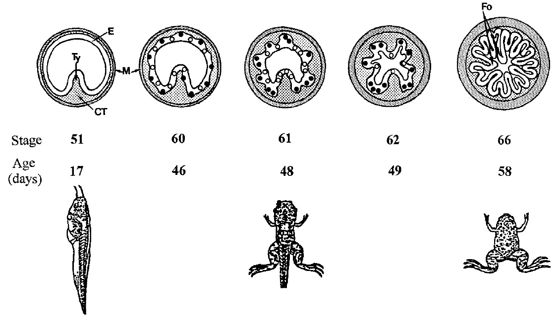The tadpole small intestine has a single epithelial fold (Ty), the