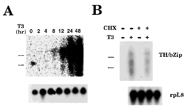 TH/bZip mRNAafter 8 hr of T3 treatment. (B) T3-induction of TH/bZip