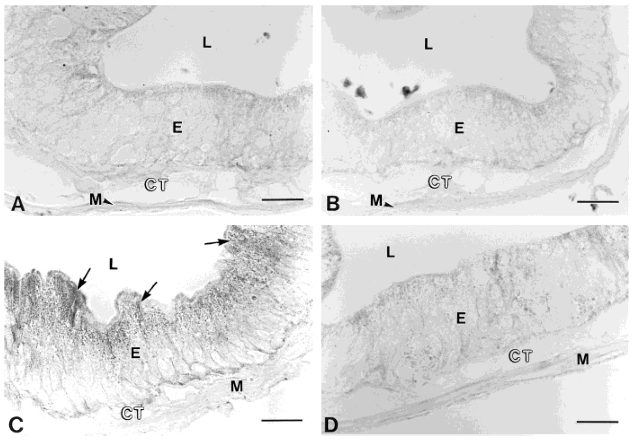 epithelium (E) facing the lumen (L), but also in the connective tissue