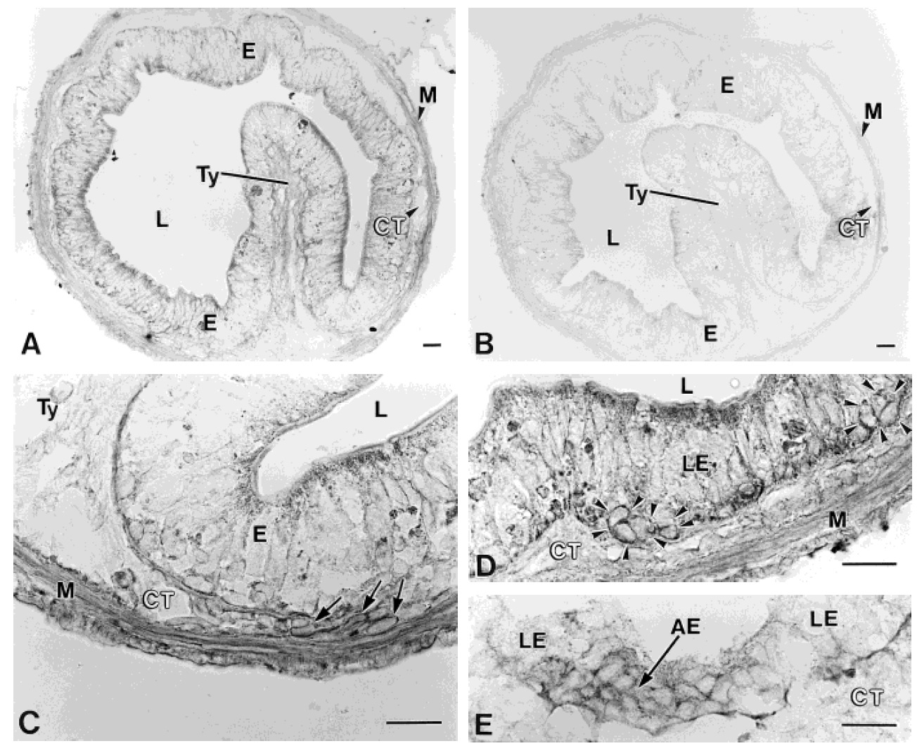 tissue cells are localized in the bottom of the typhlosole (arrows).