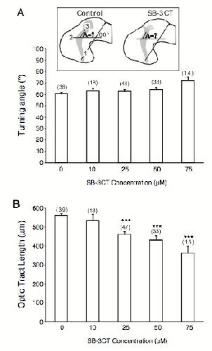 (A) Dose-response curve for SB-3CT effects on the mean turning angle. The inset shows a schematic of how the turning angle was measured for a control and a SB-3CT-treated brain. Briefly, a standard reference line (1) was drawn between the optic chiasm and the midbrain-hindbrain boundary. A second line (2) was drawn at a 60° angle to line 1, and the angle through which the RGC axons turn in the mid-diencephalon was measured as the angle between line 2 and a third line (3) drawn through the middle of the optic projection just after the turn. A demonstration of the turning angle at the mid- diencephalon is shown in Fig. 1A,C. (B) Dose-response curve for SB-3CT effects on the optic projection length. Error bars are s.e.m., and numbers in brackets represent the number of optic projections analyzed. (***P<0.001; one-way ANOVA, Student-Newmann Keuls post-hoc comparisons test).