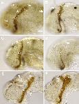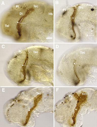Fig. 1. The MMP inhibitor SB-3CT has differential effects on two guidance decisions made by RGC axons. Lateral views of the brains and HRP-labelled optic projections of stage 40 Xenopus embryos exposed at stage 33/34 to either control media or to the MMP-specific inhibitor IV (SB-3CT). (A) Control exposed brain. (B-D) Brains exposed to SB-3CT. At concentrations of 10 μM (B) and 25 μM (C) axons extend, make the turn in the mid-diencephalon (star), but are misguided at their target, the optic tectum. A demonstration of the turning angle at the mid-diencephalon is shown in A and C. By contrast, in GM6001-treated brains we found that axons failed to make the turn, and instead grew towards the pineal gland (Webber et al., 2002). (D) With a higher concentration (50 μM) of the inhibitor, axon extension defects are sometime seen. (E,F) A cyclic peptide MMP inhibitor, CTT, produces a similar mistargeting phenotype (F), while a highly related inactive peptide, STT, has no effect on the optic projection (E). The white dots indicate the approximate anterior of the optic tectum (see Materials and methods). D, dorsal; A, anterior; Tec, tectum; Tel, telencephalon; Di, diencephalon; Pi, pineal gland; Hb, hindbrain. Scale bar: 50 μm.