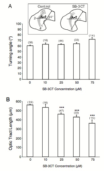Fig. 2. Quantitation of the effects of SB-3CT on RGC axon outgrowth. Camera lucida representations of the brains and optic projections of control and treated embryos were digitized and analyzed for two measures of optic projection development: the mean angle through which RGC axons turned at the mid- diencephalon (A); and the length of the optic projection (B).
