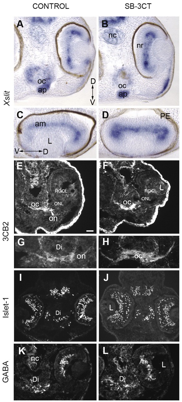 Fig. 5. Optic pathway apparently unaffected by MMP inhibition. Embryos were exposed at stage 31 to either a control solution (A,C,E,G,I,K) or 25 μM SB-3CT (B,D,F,H,J,L). At stage 37/38, embryos were fixed. (A-D) Embryos were processed as wholemounts for in situ hybridization for Xenopus slit mRNA. Vibratome sections (50 μm) were cut. The ventral diencephalon at the level of the optic chiasm is represented in A,B, and eye sections are shown in C,D. (E-H) Immunoreactivity for the glial cell marker 3CB2. (G,H) Higher power views of E,F, showing the optic nerves and the optic chiasm in the ventral diencephalon. (I,J) Islet 1 immunoreactivity showing label in the ventral region of the diencephalon adjacent to the optic chiasm, and labelling of RGCs and cells in the inner nuclear layer in the retina. (K,L) GABA immunoreactivity showing labelling of amacrine cells in the inner nuclear layer, and a population of neurons in the ventral diencephalon. L, lens; nc, notochord; ap, anterior lobe of the pituitary body; nr, neural retina; PE, pigment epithelium; oc, optic chiasm; on, optic nerve, RGCL, RGC layer; Am, amacrine cells; INL, inner nuclear layer; ONL, outer nuclear layer; Di, diencephalon. D, dorsal; V, ventral. Orientation in A is for A,B,E,L, and orientation in C is for C,D. Scale bars: in A, 50 μm for A,B; 25 μm for C,D; in E, 50 μm for E,F,I,L; 25 μm for G,H.