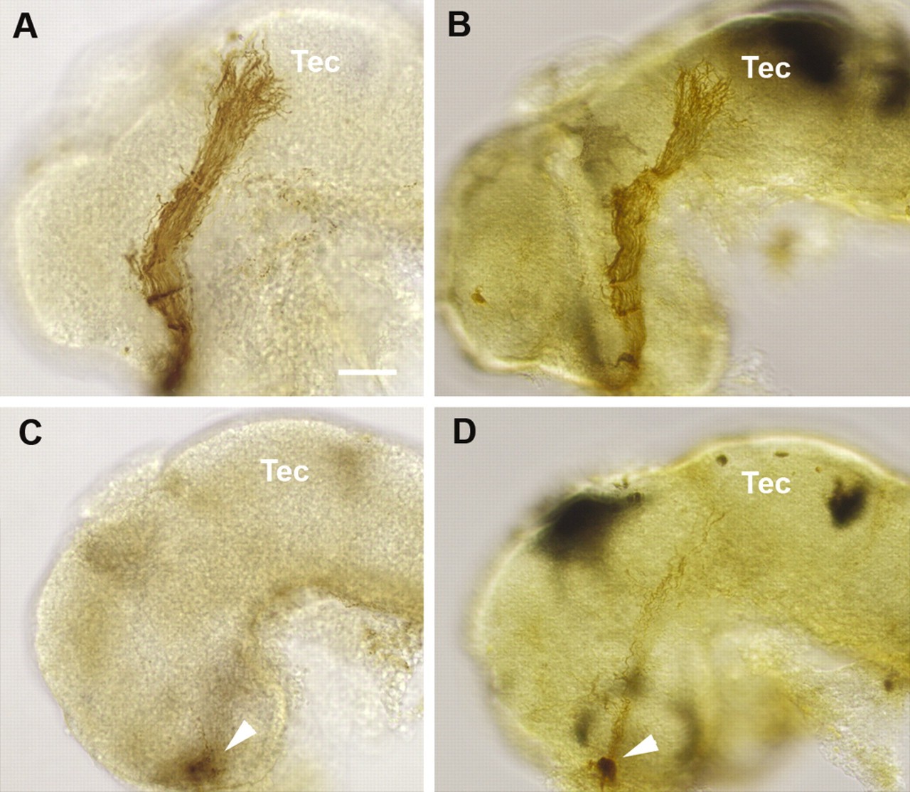 Fig. 3. RGC axons that cross the optic chiasm in the presence of metalloproteinase inhibitors fail to extend into the contralateral diencephalon. The optic chiasm was exposed at stage 30-31, by removing the cement gland and the mesenchyme underlying the ventral forebrain. Embryos were bathed in control media (A) or in media to which either the broad-spectrum metalloproteinase inhibitor GM6001 (5-10 μM; D), SB-3CT (25 μM; C) or the GM6001 negative control (5-10 μM; B) was added. At stage 40, RGC axons were anterogradely labelled with HRP. In GM6001 and SB-3CT, the optic projection (arrowhead) failed to enter the contralateral diencephalon. Tec, tectum. Scale bar: 50μ m.