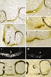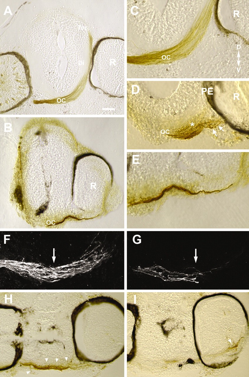 Fig. 4. Axon guidance defects caused by application of metalloproteinase inhibitors as RGC axons cross the optic chiasm. Vibratome (50 μm) sections through the diencephalon and eyes of embryos exposed at stage 31 to either control (A,C), SB-3CT (B,D,E) or GM6001 (H,I) solutions. The HRP-labelled optic projections are visible. (A,C) In control, RGC axons cross the midline at the optic chiasm and grow dorsally through the diencephalon to innervate the optic tectum. C is a higher power view of the optic chiasm shown in A. (B,D,E) In the 25 μM SB-3CT-treated brains, RGC axons often failed to enter the contralateral diencephalon (star), or grew aberrantly into the contralateral optic nerve (arrows). E is a higher power view of the optic projection shown in B and D is another example of a 25 μM SB-3CT-treated brain. (F,G) Fluorescent micrographs of the HRP-labelled optic projections in 12 μm transverse cryostat sections through the optic chiasm in the ventral diencephalon. Control axons shown in F cross the midline (arrow), whereas SB-3CT treated axons (G) stalled at the midline (arrow). (G) A more weakly labelled optic projection was chosen for visualization purposes. (H,I) Similar axonal phenotypes are observed in a 10 μM GM6001-treated brain. (H) Axons in the optic chiasm are seen to defasciculate (arrowheads). In a more caudal section (I), axons are seen within the contralateral eye (arrowhead). Tec, tectum; D, dorsal; V, ventral; oc, optic chiasm; R, retina. Scale bar: 50 μm for A,B,H,I; 25 μm for C-G.