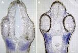 Fig. 6. MMP2 is expressed in tissues that abut the developing visual system. Embryos at stages 32 (A) and 35/36 (B) were processed as wholemounts for in situ hybridization with a digoxigenin-labelled (blue) XMMP2 antisense riboprobe. Vibratome transverse sections (50 μm) through the embryo at the level of the diencephalon. Pigmented cells are shown in black. Broken line represents the ventral diencephalon, with the optic chiasm found at the midline. The arrowheads point to Xmmp2 mRNA-expressing cells that neighbour the optic tectum. R, retina; oc, optic chiasm; Tec, tectum; Ve, ventricle; D, dorsal, V, ventral. Scale bar: 50 μm.