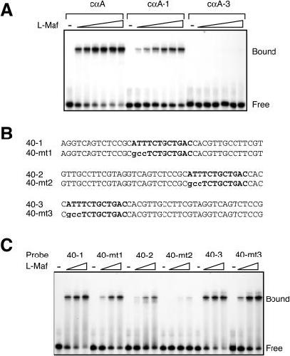 Figure 2. The effect of the 5′-flanking region on Maf binding (A) Various amounts of L-Maf (0, 5.0 × 101, 1.3 × 102, 2.5 × 102, 3.8 × 102, 5.0 × 102 and 1.0 × 103 nM) were subjected to EMSA with cαA, cαA-1 and cαA-3 oligonucleotide probes. (B) The sequences of probes used in (C). The 5′-flanking region and MARE half-site are indicated in bold. Mutated sequences are indicated by lower case letters. The oligonucleotides are as shown and do not contain any additional sequences on either end. (C) Increasing amounts of L-Maf (0, 2.5 × 102, 5.0 × 102 and 1.0 × 103 nM) were subjected to EMSA with the oligonucleotide probes shown in (B).