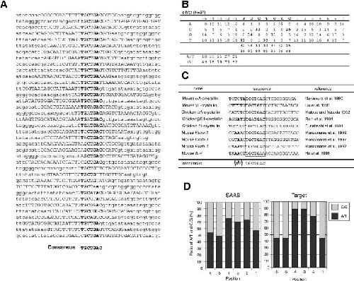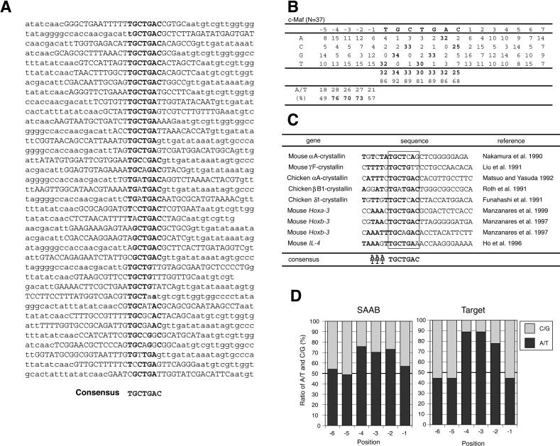 Figure 6. The MARE half-site flanked by AT-rich sequences in the 5′ region is a target sequence for Maf proteins. (A) The sequences selected by affinity for c-Maf (SAAB assay). Sequences of the MARE half-site are shown in bold capital letters, while the non-random sequences are shown in lowercase letters. (B) The table shows the number and percentage of frequencies for the 4 nt in the selected sequences shown in (A). (C) Comparison of the cαA sequences with the regulatory regions of several crystallin genes, Hoxa3, Hoxb3 and IL-4. The conserved MARE half-site is boxed, and consensus sequences are shown in bold capital letters. (D) The ratio of AT to GC in the 5′-flanking regions of MARE selected in vitro by SAAB assay and those observed in vivo.