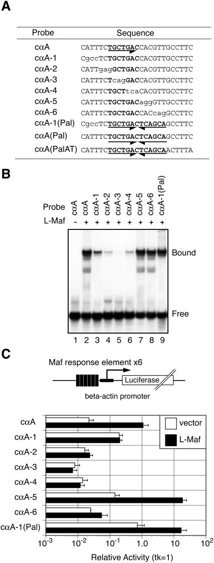 Figure 1. The 5′-flanking region of the Maf recognition element is important for transcriptional activity of L-Maf. (A) The sequences of the oligonucleotide probes used in this study. Substituted nucleotides are shown in lowercase letters. MARE is shown in bold capital letters. (B) EMSA using recombinant L-Maf. L-Maf (2.5 × 102 nM) was analyzed for its ability to bind to the oligonucleotide probes shown in (A). (C) The reporter construct is schematically represented at the top of the figure. Closed rectangles represent the six copies of cαA, its mutants (cαA-1-6), or palindromic MARE [cαA-1(Pal)], and the bold line represents the chicken β-actin minimal promoter. Neural retina cultures were transiently co-transfected with an L-maf expression plasmid and each reporter construct. Luciferase activities are represented, relative to that of the luciferase gene driven by the HSV tk promoter (tk-Luc). Average values and error bars represent duplicate assays of at least three individual experiments.