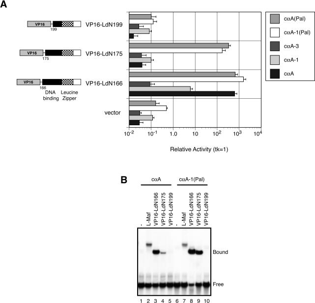 Figure 3. The N-terminus of the DNA-binding domain is responsible for the binding of L-Maf to the 5′-flanking sequence. (A) Effects of deletions of the DNA-binding domain of L-Maf on transcriptional activity. Structures of the VP16-L-Maf chimeric proteins are represented schematically in the left panel. Neural retina cultures were transiently co-transfected with each chimeric VP16-L-Maf expression plasmid and the reporter construct. Luciferase activities are shown, relative to that of the luciferase gene driven by the HSV tk promoter (tk-Luc). Average values and error bars represent duplicate assays of at least three individual experiments. (B) DNA-binding activities of the VP16-L-Maf chimeric proteins were analyzed by EMSA. All proteins were prepared in vitro using a reticulocyte lysate.