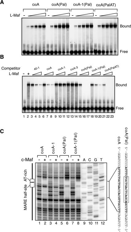 Figure 7. The 5′-AT-rich sequence increases the binding activity for palindromic MARE. (A) Increasing amounts of L-Maf (0, 5, 1.3 × 101, 2.5 × 101, 5 × 101 and 2.5 × 102 nM) were subjected to EMSA with the cαA, cαA(Pal), cαA-1(Pal) and cαA(PalAT) oligonucleotide probes. (B) Comparison of binding activities by competition analysis. Recombinant L-Maf was incubated with labeled 40-1 probe (0.75 nM) and indicated competitors (100×, 500× and 1000×). Lane 1 shows only 40-1 probe and lane 2 shows the complex of L-Maf and 40-1 probe. (C) Recombinant c-Maf and four different probes [cαA, cαA-1, cαA(Pal) and cαA-1(Pal)] were subjected to DNase I footprinting assay. Results of the assay are shown (lanes 1–8), along side sequencing ladders for reference (lanes 9–12). The sequence protected by c-Maf is shown to the right in bold. The palindromic MARE is boxed. The 5′-AT rich region and MARE half-site are shown to the left in rectangles.