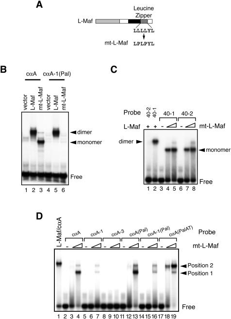 Figure 8. Maf binds to the 5′-AT-rich half-site of MARE as a dimer. (A) Schematic representation of mt-L-Maf carrying mutation in the leucine zipper region. (B) In vitro translated L-Maf and mt-L-Maf proteins were subjected to the EMSA with cαA and cαA-1(Pal) oligonucleotide probes. (C) Recombinant mt-L-Maf recognizes only the half-site MARE. L-Maf (2.5 × 102 nM) and mt-L-Maf (7.5 × 102 and 1.9 × 103 nM) were incubated with 40-1 and 40-2. Lanes 1 and 2 show complexes of recombinant L-Maf (2.5 × 102 nM) and 40-2 or 40-1, respectively. (D) The binding activities of recombinant mt-L-Maf. mt-L-Maf (7.5 × 102 and 1.9 × 102 nM) was incubated with the indicated probes. Lane 1 shows the complex of L-Maf (2.5 × 102 nM) and cαA.