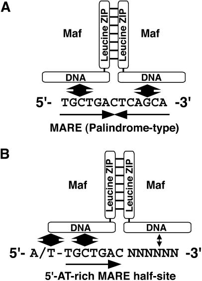 Figure 9. Proposed model for Maf protein binding to the 5′-AT rich MARE half-site Maf proteins have two types of target sequences, a palindrome-type (A) and half-site type (B). (A) Maf binds to the MARE palindrome as homodimer and there are specific interactions between each DNA-binding region and a half-site of MARE (TGCTGAC). (B) Our results show that Maf proteins can also bind as homodimers on MARE half-sites that contain an AT rich 5′ region. This region is critical for Maf protein binding and subsequent transcriptional activation.