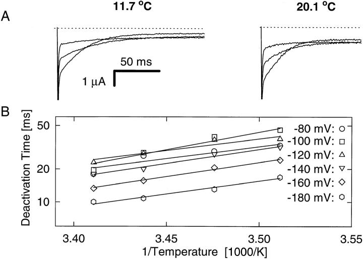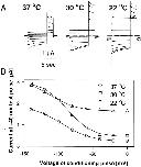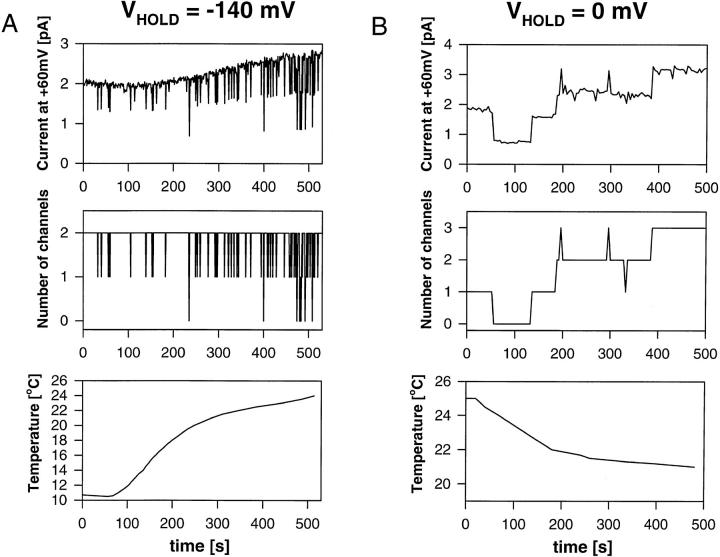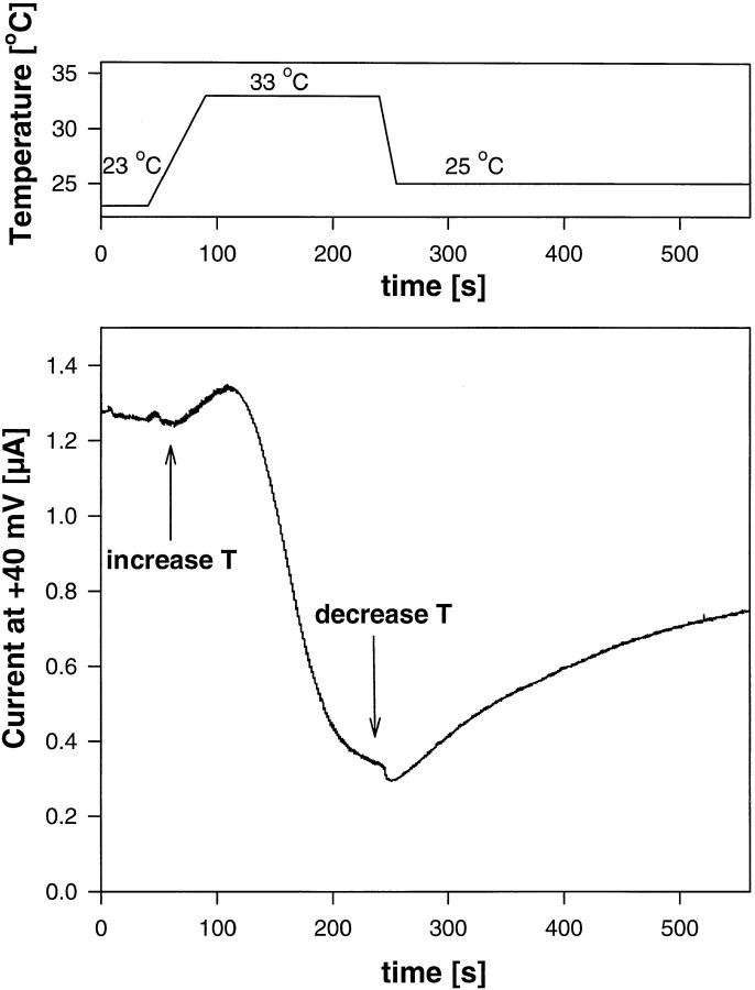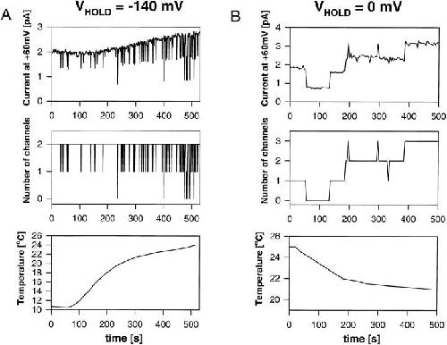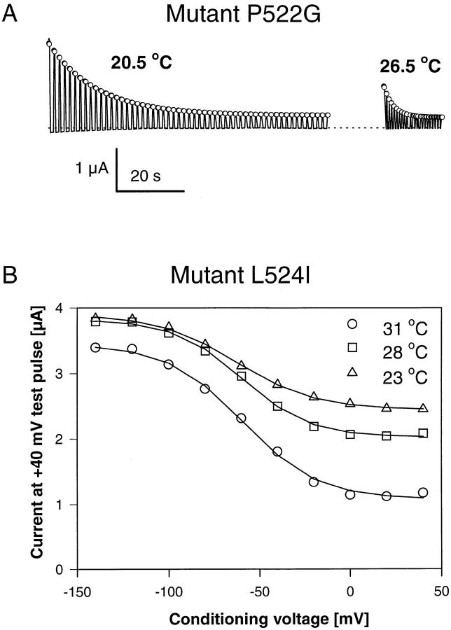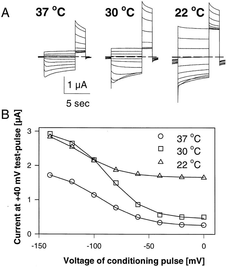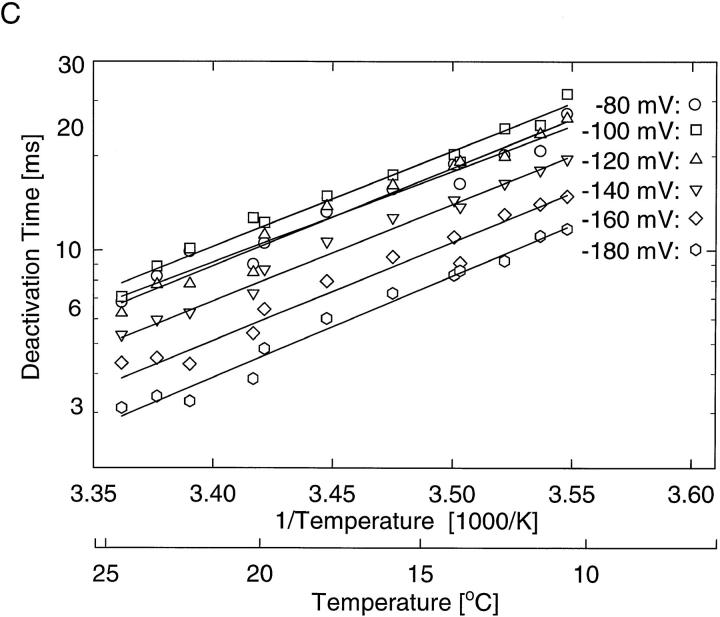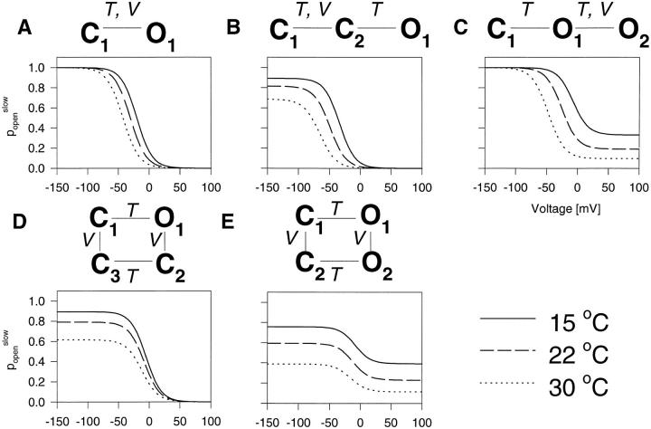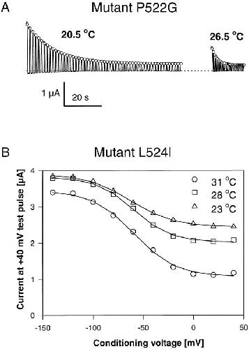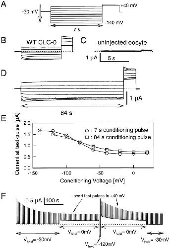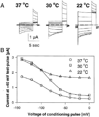 The chloride channel from the Torpedo electric organ, ClC-0, is the best studied member of a large gene-family (Jentsch, T.J. 1996. Curr. Opin. Neurobiol. 6:303-310.). We investigate the temperature dependence of both the voltage- and chloride-dependent fast gate and of the slow gate of the "double-barreled" ClC-0 expressed in Xenopus oocytes. Kinetics of the fast gate exhibit only a moderate temperature dependence with a Q10 of 2.2. Steady-state P(open) of the fast gate is relatively independent of temperature. The slow gate, in contrast, is highly temperature sensitive. Deactivation kinetics at positive voltages are associated with a Q10 of approximately 40. Steady-state open probability of the slow gate (P(open)slow(V)) can be described by a Boltzmann distribution with an apparent gating valence of approximately 2 and a variable "offset" at positive voltages. We note a positive correlation of this offset (i.e., the fraction of channels that are not closed by the slow gate) with the amount of expression. This offset is also highly temperature sensitive, being drastically decreased at high temperatures. Paradoxically, the maximum degree of activation of the slow gate also decreases at higher temperatures. The strong temperature dependence of the slow gate was also observed at the single channel level in inside-out patches. The results imply that within a Markovian-type description at least two open and two closed states are needed to describe slow gating. The strong temperature dependence of the slow gate explains the phenotype of several ClC-0 point-mutants described recently by Ludewig et al. (Ludewig, U., T.J. Jentsch, and M. Pusch. 1996. J. Physiol. (Lond.). In press). The large Q10 of slow gating kinetics points to a complex rearrangement. This, together with the correlation of the fraction of noninactivating channels with the amount of expression and the fact that the slow gate closes both protochannels simultaneously suggests that the slow gate is coupled to subunit interaction of the multimeric ClC-0 channel.
