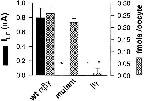Figure 3. Cell surface expression and macroscopic ILiof wt ENaC (n = 39), triple Cys mutant (αSCβSCγSC) (n = 36) and βγ subunits (n = 41). Filled bars represents ILi. Hatched bars represents specific binding per oocyte of M2AB ([125I]M2IgG1) antibodies (fmols/oocyte) directed against a FLAG epitope introduced in the ectodomain of β and γ wt and mutant subunits. *Denotes statistical significance <0.001.