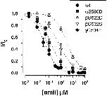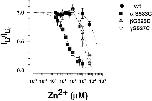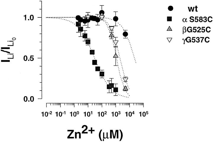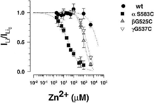 Figure 6. Block of wt ENaC and mutants by external Zn2+. Concentration dependence of Zn2+ inhibition of inward Li+current. I/I0represents the current ratio measured in the presence/absence of external Zn2+. Inhibitory constants (Ki) were obtained from best fit of the data to a Langmuir inhibition isotherm (dotted lines). Zn2+ Ki were >10 mM for wt ENaC (n = 34), 29 μM for αS583C (n = 42), 1.1 mM for βG525C (n = 10), and 1.9 mM for γG537C (n = 14).