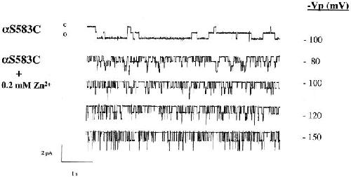 Figure 7. Single channel recording of αS583C mutant in absence or with 0.2 mM Zn2+in the external solution. In the presence of Zn2+ channel activity (n · Po) was 0.64 at −80 mV, 0.46 at −100 mV, 0.44 at −120 mV, and 0.35 at −150 mV.