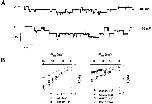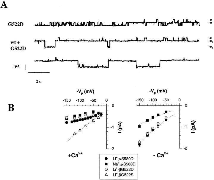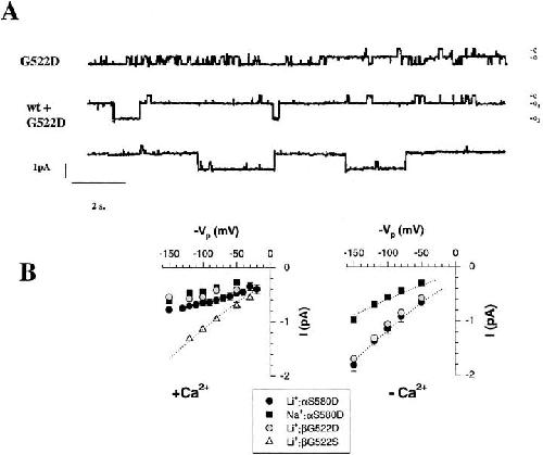Figure 8. Effects on single channel conductance of introducing negatively charged residues Asp in the pre-M2 segment of αβ subunits. (A) Upper tracing shows single channel recording in oocytes expressing α, βG522D, γ mutants. The lower tracings were recorded from an oocyte expressing both βG522D and β wild type together with α and γ subunits. Two channels with different conductances can be observed. (B) Left: I-V relationship of αS580D, βG522D, and βG522S in the presence of with 1.8 mM Ca2+ in the patch pipet. Cord Li+conductance was 9.6 pS for βG522S. Right: I-V relationship of S580D, G522D in the absence of Ca2+ in the pipet. Cord conductance were 6.7 and 11 pS for S580D in the presence of Na+and Li+respectively and 11 pS for βG522D with Li+ions. Each point represents a mean value of three to five channels.