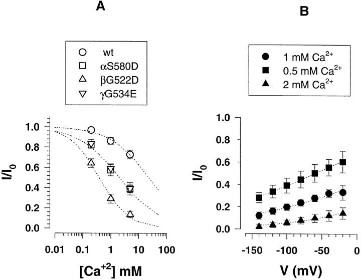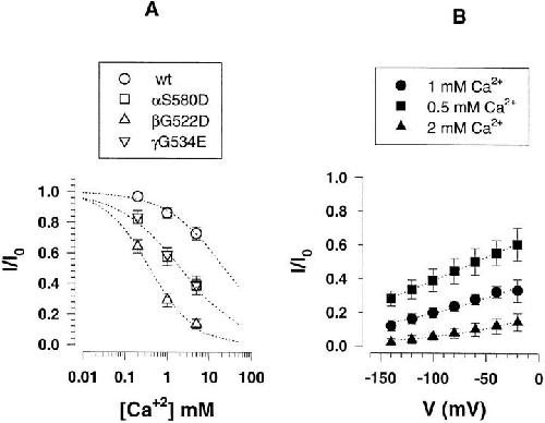 Figure 9. Block of αS580D, βG522D, γG534E mutants by external Ca2+. Mutant subunits were coexpressed with α, γ wild-type subunits. (A) Concentration dependence of inhibition of Li+current by external Ca2+. The ratio I/I0 represents the measured ILiin the presence/absence of external Ca2+ions. Ca2+ inhibitory constants (Ki) obtained from fit to inhibition Langmuir isotherm (dotted lines) were 2.1 mM for the αS580D (n = 8), 0.4 mM for βG522D (n = 10), and 2.2 mM for γG534E (n = 8). (B) Voltage dependence of βG522D mutant block by external Ca2+ at concentrations of 0.5, 1, and 2 mM (n = 4). Dotted lines represent fit of the data to Eq. 2 (see materials and methods) gave Ki(0) values of 0.67, 0.97, and 0.49, z′ values of 0.26, 0.28, and 0.35 for the experiments done with respectively 0.5, 1, and 2mM Ca2+.