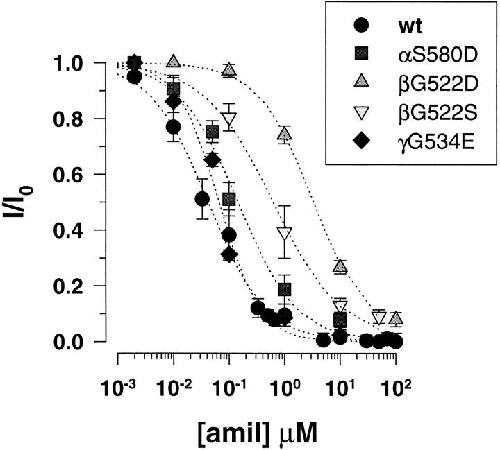 Figure 10. Decreased sensitivity of βG522D mutant to amiloride. Dose-dependent inhibition of Li+current by amiloride. Inhibitory constants (Ki) obtained from fit of the data to inhibition Langmuir isotherm were 0.14 μM for αS580D (n = 12), 0.06 μM for γG534E (n = 8), 3.4 μM for βG522D (n = 16), and 0.6 μM for βG522S (n = 10).
