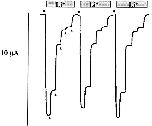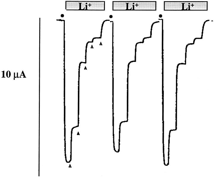 Figure 2. Representative tracings of macroscopic inward Li+current recorded in three different oocytes expressing wild-type ENaC αβγ subunits. Substitution of 20 mM KCl with 20 mM LiCl in the external sucrose buffer medium (•) induced an inward Li+current that was inhibited by addition of 10 nM, 100 nM, 330 nM, 660 nM, 5 μM indicated by the filled triangles (▴).