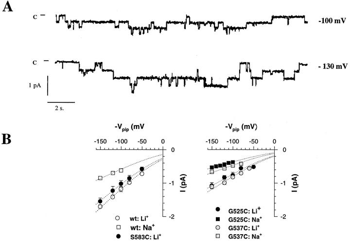 Figure 4. Effects of introducing Cys residues in pre M2 segment at positions αS583, βG525, and γG537. (A) Single channel tracings of βG525C mutant recorded with Na+as permeating ion. (B) Left: I-V relationships of wt ENaC and αS583C mutant. Cord conductance for wt ENaC (wt) in the presence of Na+was 5.1 and 10 pS with Li+. Li+conductance of αS583C was 8.9 pS. Right: I-V relationships for βG525C and γG537C. In the presence of Na+and Li+ions, cord conductances were, respectively, 3.2 and 5.8 pS for βG525C, 4 and 6.23 pS for γG534C. Dotted lines represent fit of the data of the I-V relationships according to the constant field equation. Each point represents mean value of two to five channels.