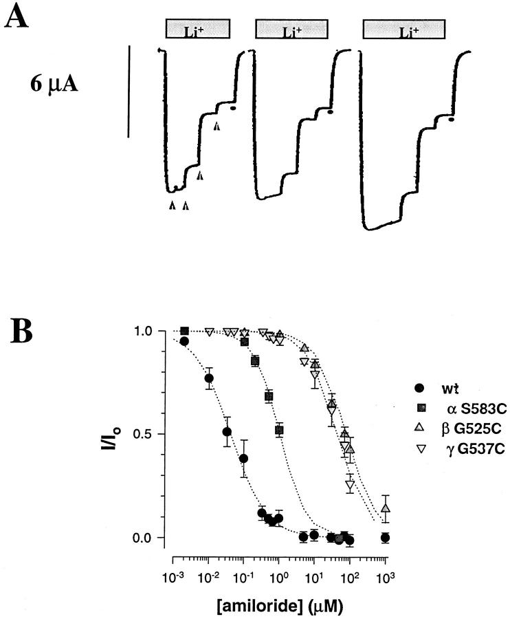 Figure 5. Amiloride sensitivity of αβγ Cys mutants. (A) Original tracings of amiloride inhibition of inward Li+current in oocytes expressing βG525C mutant together with α and γ subunits. Triangles (▴) represent addition of external amiloride at increasing concentrations of 0.1, 10, 70, and 100 μM, and • indicates return to the starting K solution. (B) Titration curve of Li+current by amiloride. I/I0 is the ratio of blocked over unblocked Li+current. Li+ current was measured in individual oocytes in the presence of four different amiloride concentrations (wt-ENaC, n = 82; αS583C, n = 27; βG525C, n = 59; γG537C, n = 14) Dotted lines represent fit of data to a Langmuir inhibition isotherm (see materials and methods).