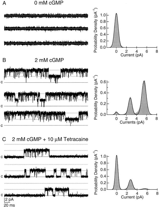 Figure 7. The effect of tetracaine block on single channels. All data shown are from a single patch containing two rod channels recorded at +80 mV. Amplitude histograms were constructed from 30 s of continuous recording. c represents the current present when both channels are closed. Dashed lines represent the currents present when one or both of the channels are open. The position of the lines representing the open states were derived from fits to the histograms and are the same in the presence and absence of tetracaine. Fits to binned data are to an equation for the sum of two Gaussians constrained so that the distribution of open channels follows a binomial distribution with N = 2 (see methods). (A) In the absence of cGMP, both channels are closed. Fits to the histogram are with Po= 0.0 and σ = 0.38 pA. (B) At saturating (2 mM) cGMP, both channels spend most of their time open. Fits to the histogram are with i = 2.74 pA, σ = 0.27 pA, ɛ = 0.25 pA, Po = 0.83. (C) Addition of 10 μM tetracaine causes the channels to spend less time in the open state. Fits to the histogram are with the same values as in the absence of tetracaine except that Po = 0.17. Tetracaine does not cause the single-channel amplitude, i, to change.