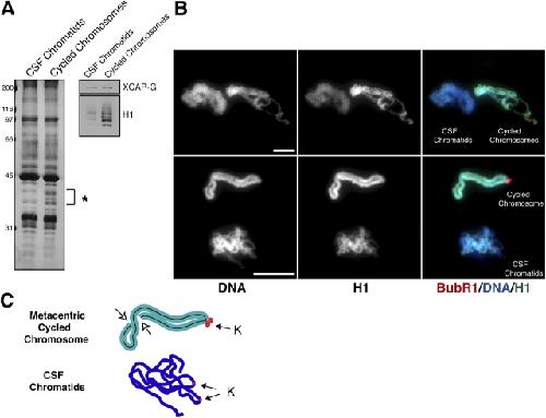 Figure 2. CSF chromatids recruit reduced levels of histone H1. (A) Comparison of chromatin proteins that are associated with unreplicated chromatids formed in a CSF extract with cycled mitotic chromosomes that have undergone duplication. Silver-stained gel reveals a similar protein pattern, except in the region marked by an asterisk at ∼40 kD. By using Western blot analysis, we find that the proteins enriched in this region on duplicated chromosomes correspond to histone H1 bands, whereas XCAP-G levels appear similar. (B) Fluorescence images showing H1 and kinetochore marker BubR1 staining on CSF chromatids and duplicated mitotic chromosomes. Assembly reactions were fixed separately and were then pooled before isolating structures onto a coverslip and processing for immunofluorescence staining. Cycled chromosomes were discernible from CSF chromatids based on DNA morphology, BubR1staining intensity, and the presence of paired sister chromatids and kinetochores. The top panels are from one field of view containing the two types of assembled chromatin structures: CSF chromatids and cycled chromosomes, as indicated in the merged image. Each cluster contains approximately six to eight chromatids or cycled chromosomes. The bottom panels are enlarged images of another field of view showing one individual cycled chromosome next to two CSF chromatids, as indicated in the merged image. Enrichment of histone H1 on duplicated chromosomes is most clearly evident in the merged images. Bars, 10 μm. (C) Schematic diagram of the structures shown in the bottom panels of B. The top structure is a metacentric chromosome consisting of two sister chromatids, delineated by the black line and partially folded back on itself. The open arrows point to the two ends of the cycled chromosome. Based on BubR1 staining, the bottom structure likely consists of two tangled CSF chromatids. Closed arrows point to the kinetochores (K).