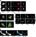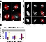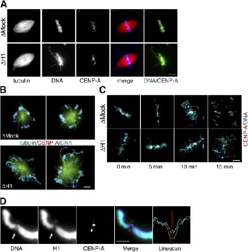 Figure 6. Kinetochores appear to function normally in the absence of histone H1. (A) Kinetochores visualized by CENP-A immunofluorescence localize to the metaphase plate despite misalignment of chromosome arms in the absence of H1. In the merged image, microtubules are red, DNA is blue, and CENP-A is green. The DNA/CENP-A merged image is meant to further highlight the observed metaphase clustering of CENP-A despite arm misalignment. DNA is green and CENP-A is purple. Bar, 10 μm. (B) Kinetochores attach and orient similarly in mock- and H1-depleted spindles treated with Eg5 inhibitor monastrol. Note CENP-A staining (red) on discrete kinetochores that were attached to microtubules and were oriented toward the center of monoaster structures. Microtubules are green and DNA is blue. Bar, 10 μm. (C) Kinetochores segregate during anaphase in the absence of H1. Samples from mock- and H1-depleted spindle reactions induced to enter anaphase were fixed at 5-min intervals. Kinetochores visualized by the addition of directly labeled CENP-A antibodies segregate similarly in both reactions, whereas chromosome arms (blue) are elongated and tangled in the absence of H1. Bar, 10 μm. For time-lapse videos of kinetochore segregation in the presence and absence of H1, see Videos S1 and S2 (available at http://www.jcb.org/cgi/content/full/jcb.200503031/DC1). (D) Duplicated X. laevis sperm chromosomes stained with antibodies to histone H1 (green), CENP-A (red), and Hoechst DNA dye (blue). Linescan shows relative intensity of staining along the length of the chromosome. Note the lack of H1 signal on centromeric DNA nubbin (arrows). Bar, 2.5 μm.