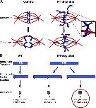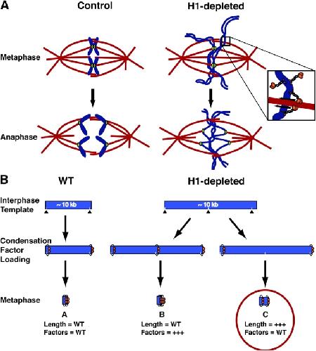 Figure 7. Schematics illustrating the potential role of histone H1 in chromosome condensation, alignment, and segregation. (A) Illustration comparing X. laevis spindles and chromosomes in metaphase and anaphase in the presence or absence of H1. Note that the kinetochores align and segregate normally in both mock- and H1-depleted conditions. H1-depleted chromosome arms do not align properly as a result of their elongated conformation. Inset highlights how elongated chromosomes would have productive microtubule–chromokinesin interactions within the confines of the spindle but not when dangling outside. H1-depleted chromosomes do not segregate properly as a result of their extended length and the presence of twisted and tangled chromatids that remain in the center of the spindle. (B) A closer analysis of H1-depleted interphase chromatin length and condensation factor levels could differentiate between two potential mechanisms of condensation factor deposition onto the chromatin template. Scenario A represents the compaction of a wild-type interphase fiber by condensation factors. Scenarios B and C assume the H1-depleted interphase chromatin template is physically longer than the wild-type template. If condensation factors are deposited at specific physical distances along the chromatin template (schematically represented by triangles and hatchmarks), then mitotic chromosome length might be normal (scenario B) in H1-depleted chromosomes. Regardless of the effect on metaphase length, scenario B would lead to increased levels of condensation factors on H1-depleted chromosomes. However, if the distribution of condensation machinery is defined at the level of the DNA template (∼10 kb), then compaction of H1-depleted interphase chromatin would generate longer metaphase chromosomes with the same level of condensation factors as wild-type chromosomes (scenario C). Our data support scenario C.