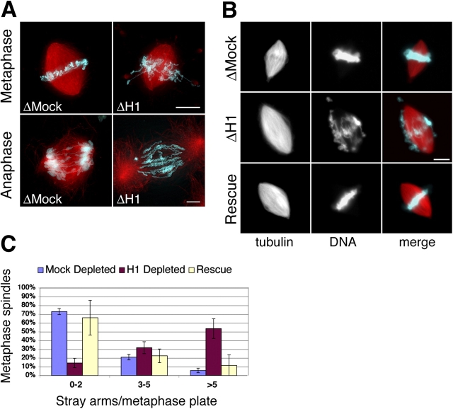 Figure 4. H1 depletion prevents proper chromosome alignment and segregation by the mitotic spindle. (A) Mock- and H1-depleted spindle assembly reactions containing rhodamine-labeled tubulin and stained with Hoechst DNA dye reveal that chromosomes cannot align properly in metaphase in the absence of H1 and are not effectively segregated during anaphase. (B) Fluorescence images of metaphase spindles showing that chromosome alignment defects caused by H1 depletion can be rescued by the readdition of somatic H1 to 1.5 μM. In merged images, microtubules are red and DNA is blue. (C) Quantification of chromosome alignment defects. The number of arms that had strayed from the metaphase plate were counted in mock- and H1-depleted spindles and in H1-depleted spindle reactions supplemented with purified H1 (mock depleted, n = 459; H1 depleted, n = 448; rescue, n = 165). The percentages of metaphase spindles with 0–2, 3–5, and >5 misaligned arms are shown. Error bars represent SD. Bars, 10 μm.