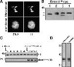 Figure 1. Characterization of embryonic histone H1. (A) Immunofluorescence of individual sperm nuclei in X. laevis egg extract reactions in metaphase and interphase, stained with affinity-purified antibodies raised to embryonic histone H1 and costained with Hoechst DNA dye to show colocalization. Bar, 10 μm. (B) Western blot of four different X. laevis egg extract preparations probed with H1 antibodies that show variation in molecular mass. The three lines show relative positions of three different H1 isoforms. (C) Western blot of samples collected at 15-min time intervals from a CSF egg extract induced to enter interphase by calcium addition and then back into metaphase by the addition of fresh CSF extract. H1 migration does not change during interphase and metaphase. Phospho-H3 epitopes appear only in mitotic samples. (D) Embryonic histone H1 purified from extract that was pooled from the eggs of ∼20 frogs yielded at least four bands by SDS-PAGE and coomassie staining (left lane), all of which were recognized by Western blot analysis with affinity-purified H1 antibodies (right lane) and were confirmed by mass spectrometry to be embryonic H1 (not depicted). The destained gel was delivered to the Howard Hughes Medical Institute Mass Spectrometry Facility (University of California Berkeley) for protein band excision, digestion, and mass spectrometric analysis.