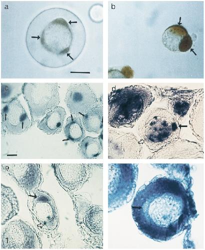 diplotene stage oocytes (arrow points to unstained pre-mitochondrial cloud). Each bar represents 10 mm.