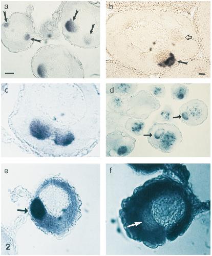 hybridization of Xlsirt probe to early diplotene oocytes (filled arrow points to high level of accumulation in one precloud while open