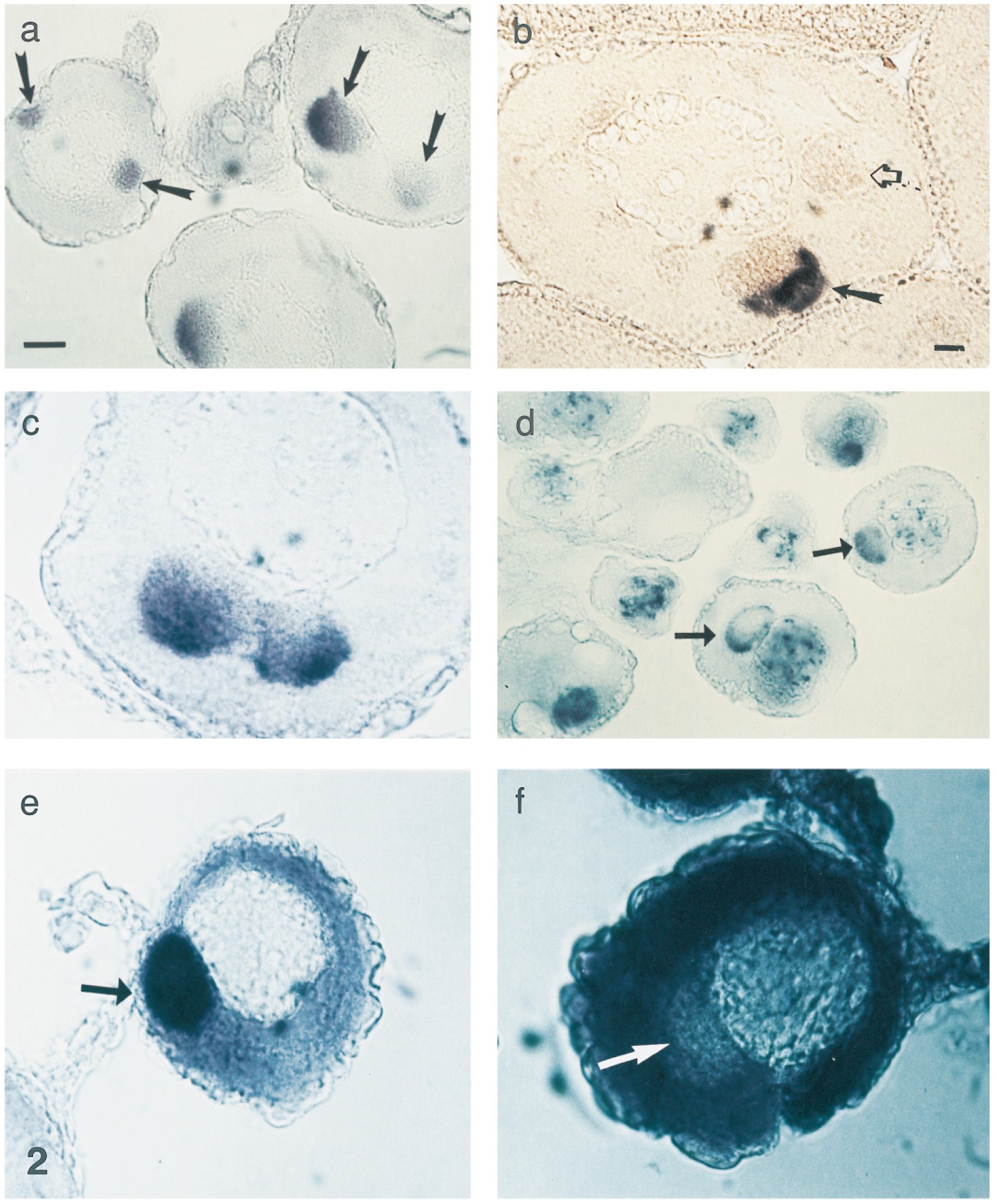 level of accumulation in one precloud while open arrow points to low level of accumulation); (f) hybridization of Vg1 probe to early
