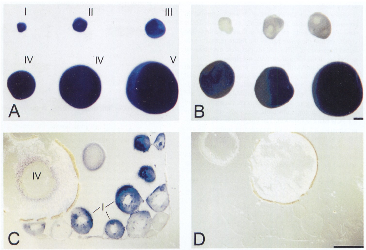 numbers. Young and advanced stage IV are shown. (C,D) In situ hybridization on 20pm cryosections of ovary from a young frog (CD) was performed