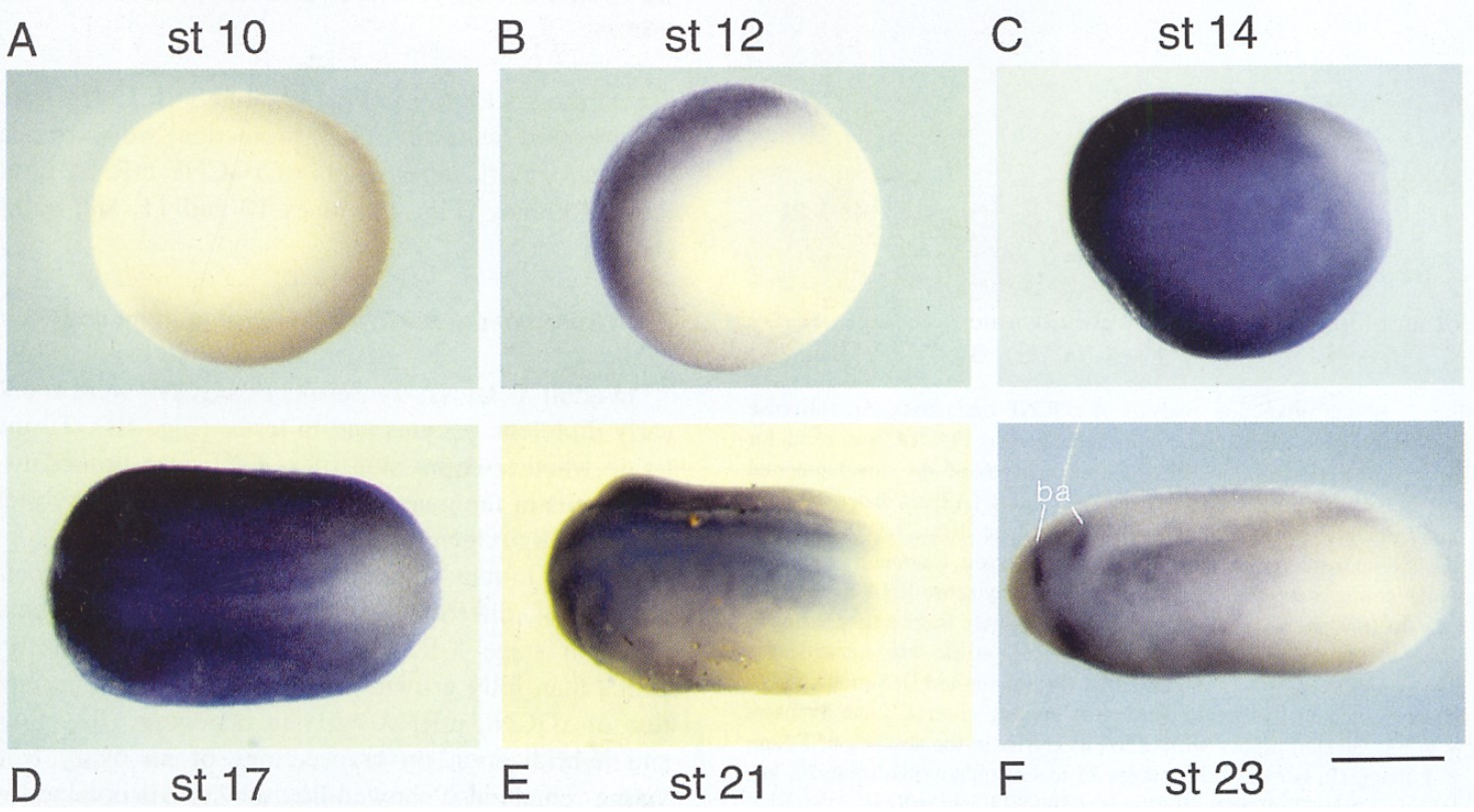 gradient of xGCNF mRNA expression at stages 12.5-21 (B-E) and labelling of the branchial arches (ba) at stage 23 (F). Bars, 0.5 mm.
